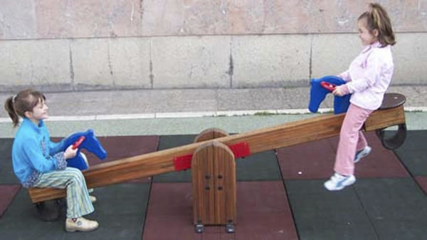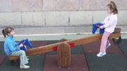 Balancí de 2 places amb seients de compacte HPL i amb siluetes de cavalls amb nanses i peu central amb sistema metàl·lic de gir.