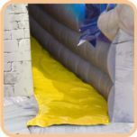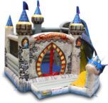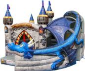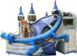 Castell inflable Dragon Age d'ús comercial. Un inflable decorat amb forma d'un castell medieval de fantasia i un drac que té tres activiades de jocs. Una zona de salt àmplia, després una paret d'escalada que acaba en un tobogan circular que finalitza a l'entrada
