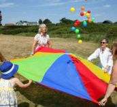 El joc del paracaigudes està fet de niló amb colors vius i nanses vermelles perquè els participants puguin agafar-se bé. Plegat ocupa poc espai.