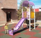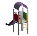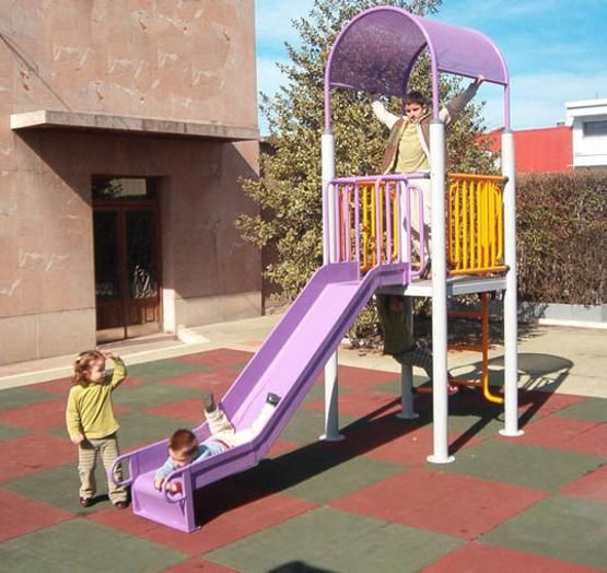 Torre d’acer de 1m x 1m amb plataforma a 120 cm d’altura. Tobogan metàl•lic.